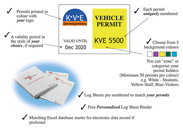 Our budget parking permit system is a self contained package that not only allows you to issue windscreen permits to authorised vehicle users, but also, used in conjunction with a vehicle log, enables you to track vehicles, users and validity.